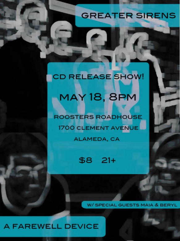 We will be playing at Roosters Roadhouse in Alameda on Friday, May 18th. This will be the CD release show for our new EP, For the Birds, so don’t miss it! You can also download digital copies of For the Birds at http://greatersirens.bandcamp.com